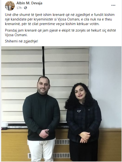 Bëhet fjalë për Albin Devaja, i cili e ka konfirmuar largimin nga LDK-ja duke ndarë një fotografi me Osmanin në Facebook.Lajmin për bashkimin e tij me Osmanin e ka shpërndarë edhe Haxhi Avdyli .