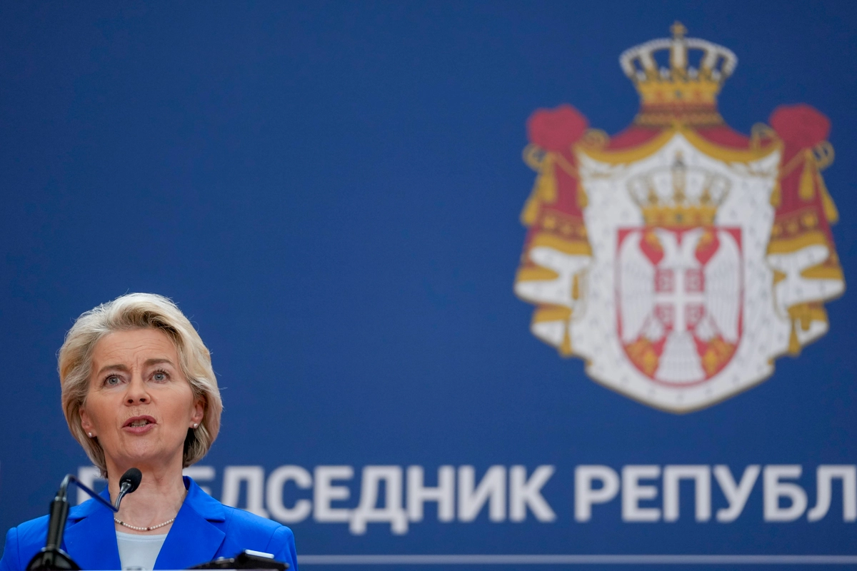 “Për çfarë bëhet fjalë – për zbatimin e Marrëveshjes së Ohrit, që parasheh hapa të ndryshëm, përfshirë pranimin e dokumenteve dhe institucioneve të Kosovës nga Serbia, dhe shkon krahas themelimit të Asociacionit të komunave me shumicë serbe, të cilin duhet ta zbatojë Kosova”, ka thënë Von der Leyen në një konferencë për media të përbashkët me presidentin e Serbisë, Aleksandar Vuçiq, duke iu përgjigjur një pyetjeje se çka nënkupton njohja de-facto e Kosovës, që e ka përmendur në Prishtinë një ditë më parë dhe që po e kërkojnë liderët evropianë.