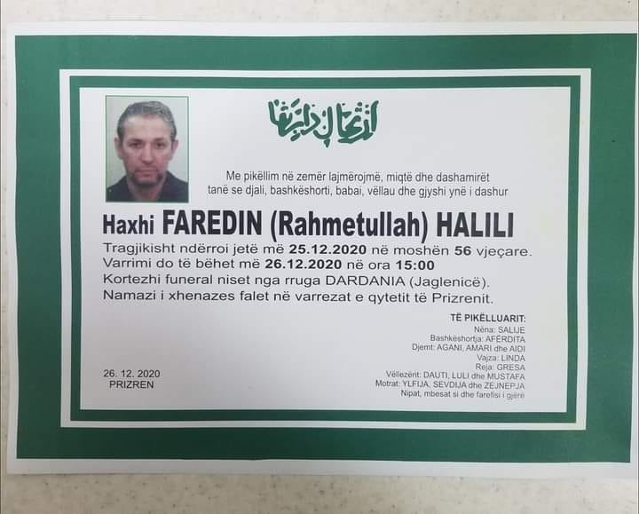 Agan Halili, vëllai i dorasit me inicialet M.H, 30-vjeçar, që vrau babain e tij sot me thikë në Prizren, ka njoftuar se varrimi i babait të tij do të bëhet sot në orën 15:00 në varrezat e qytetit të Prizrenit.