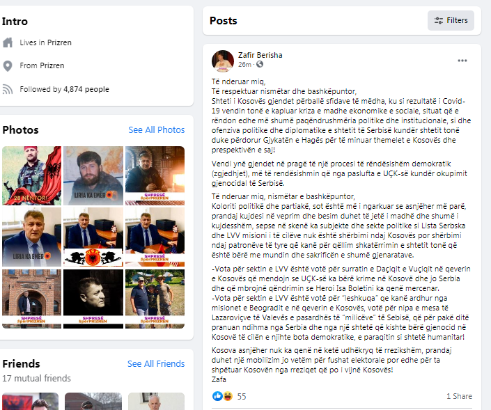 “Vota për sektin e LVV është votë për “leshkuqa” që kanë ardhur nga misionet e Beogradit e në Qeverinë e Kosovës, votë për nipa e mesa të Lazaroviçve të Valevës e pasardhës të “milicëve” të Serbisë, që për pak ditë pranuan ndihma nga Serbia dhe nga një shtet që kishte bërë gjenocid në Kosovë të cilën e njihte bota demokratike, e paraqitin si shtet humanitar!”, është shprehur ai.