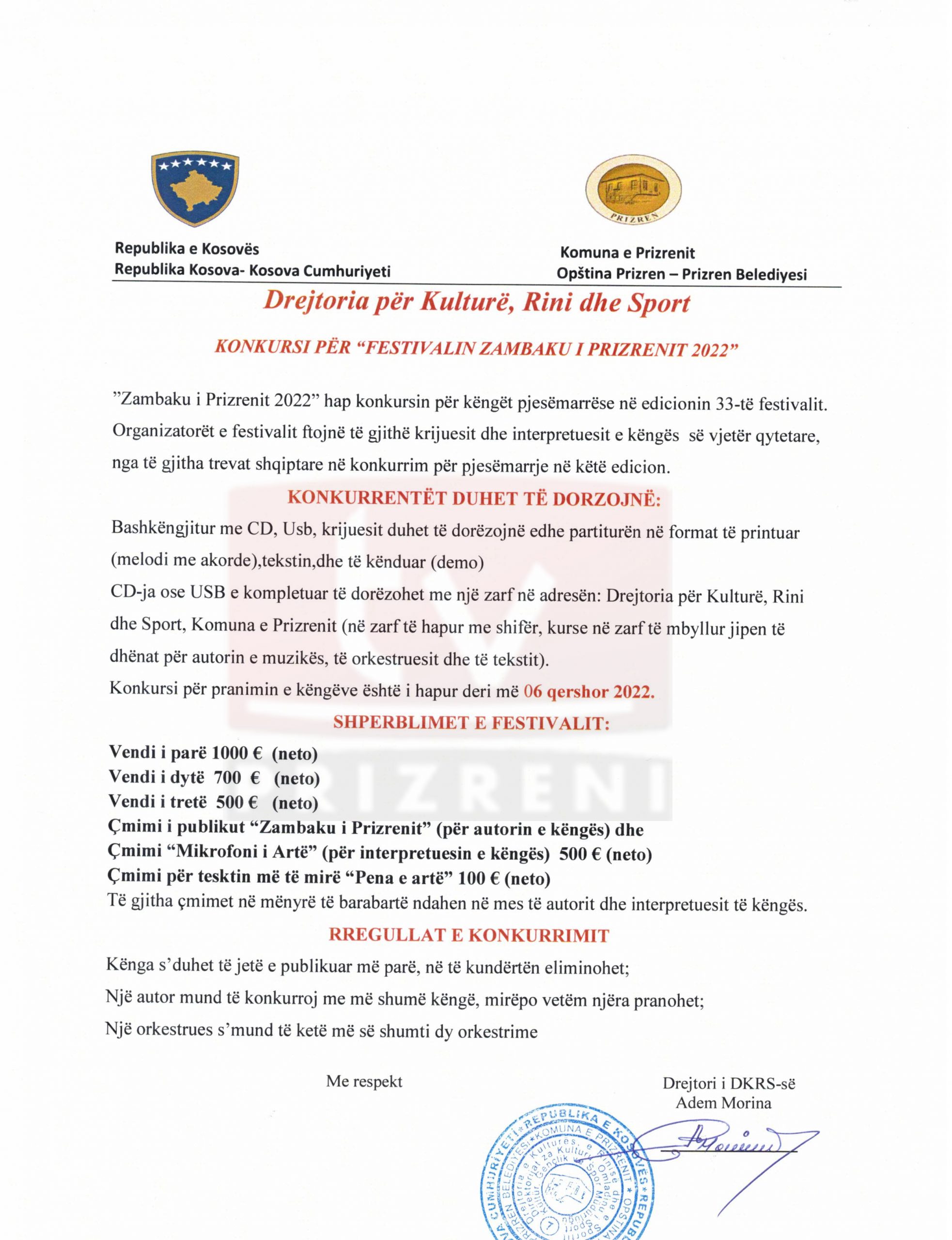 ”Zambaku i Prizrenit 2022” hap konkursin për këngët pjesëmarrëse në edicionin e 33-të festivalit, i cili do të mbahet në fund të muajit qershor të këtij viti, njofton Komuna e Prizrenit transmeton TV Prizreni.