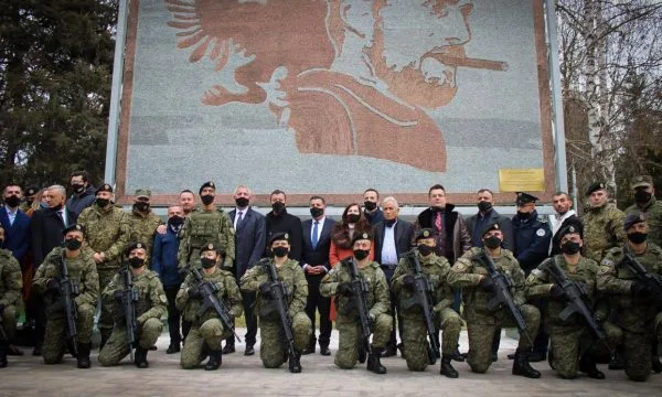 Në dy vjetorin e themelimit të Ushtrisë së Kosovës, është zbuluar sot mozaiku i figurës së heroit të kombit, Agim Ramadani, në një ceremoni të veçantë në Regjimentin e forcave tokësore të FSK’së në Gjilan.Kryetari i Gjilanit, Lutfi Haziri, ka thënë se ndihet i lumtur që pas një ekspozeu një vjeçar në qendër të qytetit, mozaiku me figurën e Agimit është zhvendosur në kazermën e FSK’së.