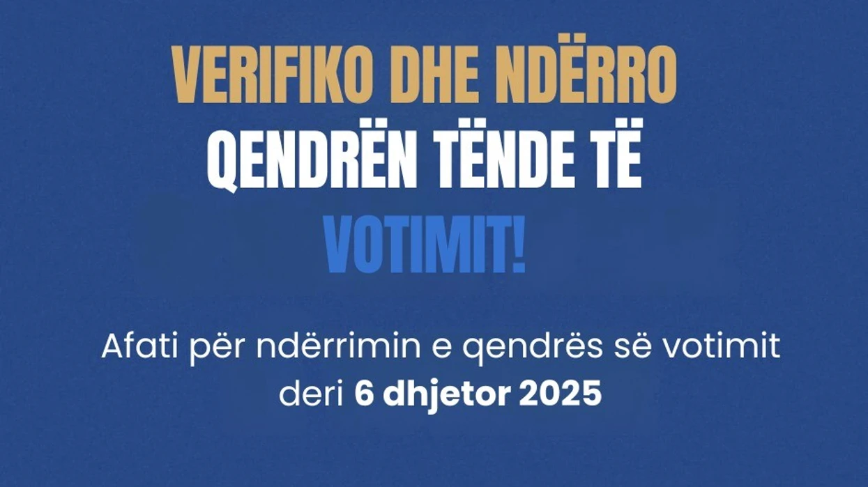 Komisioni Qendror i Zgjedhjeve ka bërë të ditur se afati për verifikimin e Qendrës së votimit, rrjedhimisht mundësisë për ta ndërruar qendrën përfundon sot më 6 dhjetor.