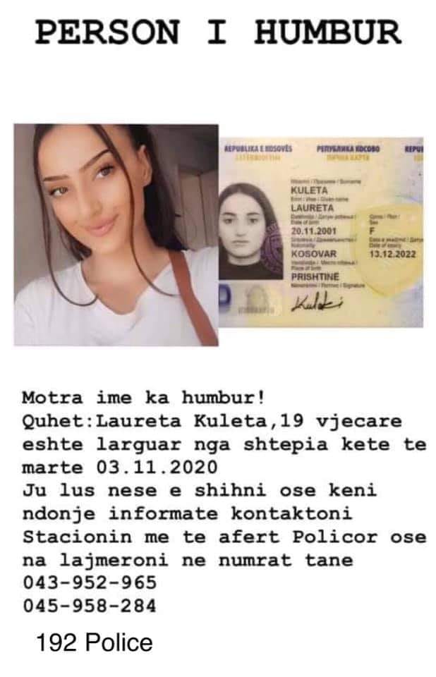 Vajza 19 vjeçare Laureta Kuleta nga komuna e Obiliqit është zhdukur që gjashtë ditë, ajo ka dalë nga shtëpia të martën e kaluar dhe me vete nuk e ka marrë letërnjoftimin e as telefonin. Familjarët e 19-vjeçares nuk dinë asgjë për vendodhjen e saj dhe kanë bërë një njoftim publik që kushdo që ka informacione për Laurtetën t’i lajmërojë ata.